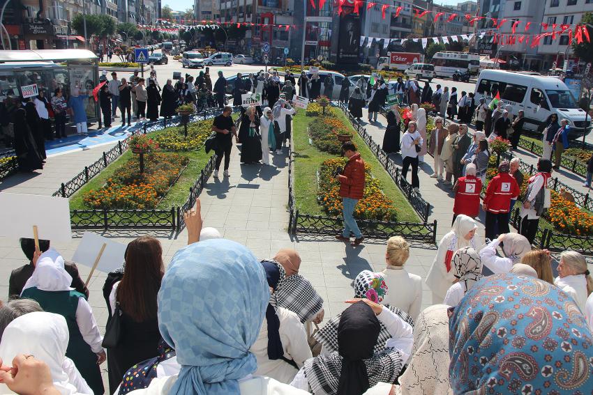 AK Parti Kadın Kolları öncülüğünde, Gazze'deki annelerin ve çocukların acısını paylaşmak amacıyla Türkiye genelinde bir farkındalık eylemi düzenlendi. Yalova'daki eylemin adresi Kent Müzesi önü oldu. Çok sayıda kadının katıldığı eyleme, AK Parti Yalova Milletvekili Meliha Akyol ve İl Başkanı Umut Güçlü de destek verdi. Topluluk, slogan atmak yerine el ele tutuşarak bir "vicdan zinciri" oluşturdu. Sessiz protesto, Gazze'de yaşanan acıların kelimelerle ifade edilemeyeceği mesajını taşıyordu. Eylemin basın açıklamasını AK Parti Yalova Kadın Kolları Başkanı Selihan Dicle Şimşek Battal okudu. Konuşmasına Gazze'deki yıkımı ve acıyı betimleyerek başlayan Battal, Gazze'li bir annenin dramını aktararak, “Duvarlara kanla yazılmış isimler. Bir annenin, bir babanın yitik hayali. Bir çocuğun hiç göremeyeceği baharı. Bir bebeğin hiç yaşayamayacağı çocukluğu. İşte bu acının adı Gazze. Bugün kadınlar olarak, Gazze'nin sessiz çığlığına ses olmak ve el ele durduğumuzu tüm dünyaya göstermek için meydanlardayız. Bugün 81 ilde kurduğumuz bu zincir, Gazze'de evlatlarını kaybeden anne babaların zinciridir. Öksüz ve yetim kalan çocukların ve insanlığını kaybetmeyen herkesin zinciridir. Gazze'li annenin şu sözlerine kulak vermek zorundayız: "Yaralıları mı kurtaracaktım, şehitleri mi taşıyacaktım, yoksa bir torba un mu bulmaya çalışacaktım? Yemin ederim, tek bir torba un getirip çocuklarımın karnının doyacağını bilsem ölüme bile razı olurum." İşte bu Gazze'li annenin sesini dünyaya duyurmak zorundayız. Bu zulmü görmezden gelen herkese soruyorum: Kalbiniz nerede? Yüce Rabbimiz, Maide Suresi 32. ayetinde mealen şöyle buyuruyor: ‘Bir insanı öldüren, bütün insanlığı öldürmüş gibidir. Bir canı yaşatan ise bütün insanlığı yaşatmış gibidir.’ Gazze bu ilahi kelamın sarsıcı bir imtihanıdır. Bizler Yalova'dan, İstanbul'dan, Hakkari'den, Trabzon'dan, Erzurum'dan ve Türkiye'nin 81 ilinden, dünyanın dört bir yanındaki kadınlara, kız kardeşlerimize sesleniyoruz: Barış kadınla mümkün.?” diye konuştu. "Barış Kadınla Mümkün" Eylemin amacının tüm kimliklerden sıyrılarak sadece "kadın" ve "insan" kimliğiyle Gazze'nin yanında durmak olduğunu belirten Battal, barışın anahtarının kadınlar olduğunu vurgulayarak, “Barışçıl bir şekilde yola çıkan ve uluslararası sularda "haydut İsrail"in hukuksuz müdahalesine maruz kalan küresel bir insani yardım filosunu dünya öylece seyretti. Hamdolsun, Türkiye, Cumhurbaşkanımız Sayın Recep Tayyip Erdoğan'ın kararlılığıyla bu adaletsizlik karşısında sessiz kalmadı. Sadece kendi vatandaşlarının değil, 13 ülkeden 101 vicdan sahibi gönüllünün de ülkelerine güvenle dönmelerini sağladı. Bizler de ablukayı delmek ve insanlık onurunu korumak için mücadele eden kahramanların ülkemize dönüşlerinde oradaydık. Hepsinin dilinde aynı temenni vardı: "Elimizden geleni yaptık, umarız Gazze'ye bir umut ışığı olabilmişizdir." İşte bugün o umut dolu sözler de bu meydanda yankılanıyor. Nehirden denize özgür Filistin! Biz bugün bütün kimliklerden sıyrılarak sadece kadın kimliğimizle buradayız. Çünkü bu mesele ne dünyadaki rollerimizle, ne taşıdığımız unvanlarla, ne de sahip olduklarımızla ilgilidir. Bu mesele insanlık meselesidir. Bugün Türkiye'den tüm dünyaya tek bir mesaj veriyoruz: Barış kadınlarla mümkündür. Slogan atmıyoruz; vicdanlarımızla haykırıyoruz. Çünkü bazı sessizlikler vardır ki arşı yere indirir ve bizim sessizliğimiz, Gazze'nin en gür çığlığı olacaktır. Şimdi sizleri de sessiz çığlık zincirimize davet ediyorum.” Diye konuştu. Battal, konuşmasında ayrıca uluslararası yardım filosuna yapılan müdahaleyi kınayarak, Cumhurbaşkanı Recep Tayyip Erdoğan'ın bu konudaki kararlı duruşuna teşekkür etti. Basın açıklamasının ardından, eyleme katılan kadınlar etkinliğin adına yakışır bir şekilde sessizce alandan ayrıldı.
