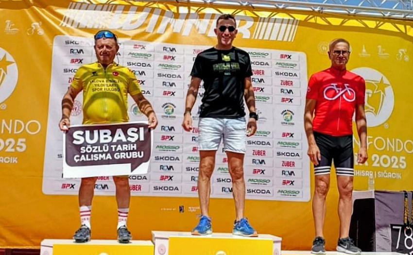 Yalova Bisiklet Yıldızları Spor Kulübü’nün lisanslı sporcusu İbrahim Kesman, Seferihisar’da düzenlenen Granfondo Amatör Yol Bisiklet Yarışı’nda 60 yaş üstü klasmanda kürsüye çıktı. Kesman, yarış sonunda açtığı pankartla Subaşı Sözlü Tarih Çalışma Grubu’na destek verdi. | ||