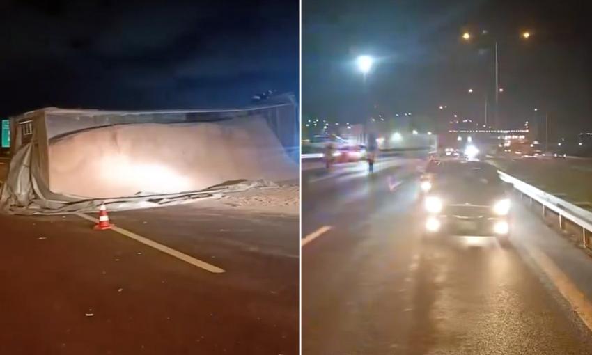 Osmangazi Köprüsü geçişinde hareketli dakikalar yaşandı. Bursa istikametinde seyir halinde olan bir kamyon, henüz belirlenemeyen bir nedenle sürücüsünün direksiyon hakimiyetini kaybetmesi sonucu kontrolden çıktı. Savrulan araç, yol kenarındaki çelik bariyerlere çarparak devrildi. Yan yatan kamyonun sürücüsü kazayı hafif sıyrıklarla atlatırken, kaza esnasında yolun boş olması olası bir facianın önüne geçti. Kaza nedeniyle köprünün Bursa istikametindeki trafik akışı tedbir amaçlı bir süre durduruldu. İhbar üzerine olay yerine gelen ekipler güvenlik önlemi alırken, devrilen kamyon çağrılan çekici vasıtasıyla yoldan kaldırıldı. Yolun temizlenmesi ve aracın çekilmesinin ardından trafik akışı yeniden normale döndü. Kazayla ilgili tahkikat başlatıldığı öğrenildi.